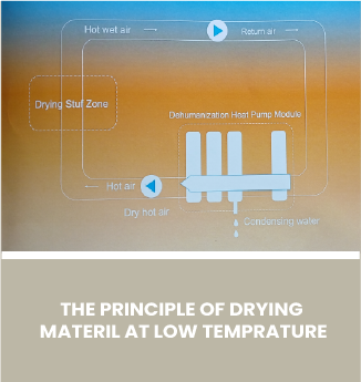 The hot dry air flows through wet materials and takes away moisture thus becomes hot wet air, which then passes through the cold end of heat pump and condenses the absorbed water (dehumidification). The cold dry air after dehumidification is then heated by the hot end of heat pump and becomes hot dry air (energy recovery). A new cycle starts.